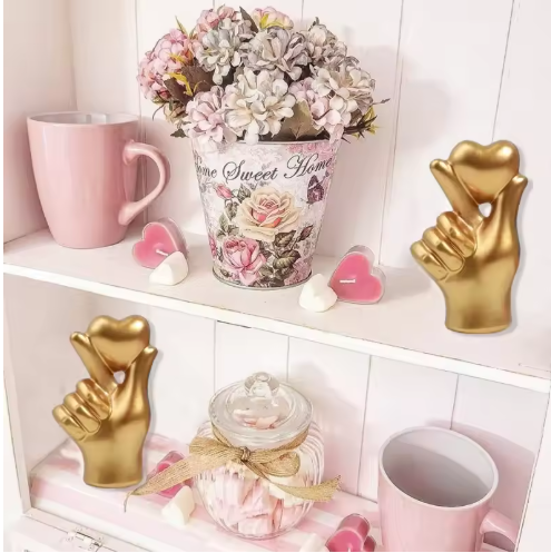 Golden finger figurine shaped like a heart, Nordic resin sculpture. This luxurious decorative piece adds a modern and elegant touch to your living room or home decor. Perfect as a charming ornament to express love and style.